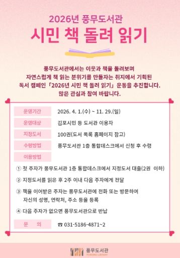 경기호연뉴스 민선기 기자 | 김포시 풍무도서관은 오는 4월부터 ‘2026년 시민 책 돌려 읽기’ 독서 릴레이를 운영한다.