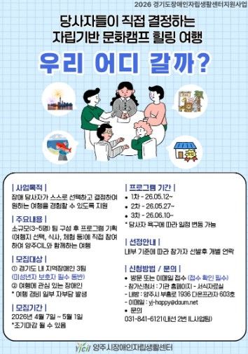경기호연뉴스 민선기 기자 | 양주시장애인자립생활센터에서는 장애인 당사자가 직접 선택하고 결정하는 자립 기반 힐링 여행을 목적으로 하는 지역 장애인 문화캠프 [우리 어디 갈까?] 참가자를 모집한다.