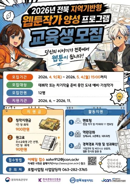 경기호연뉴스 민선기 기자 | (재)전북특별자치도 콘텐츠융합진흥원(이하 진흥원, 원장 김성규)은 전북 웹툰 산업의 미래를 이끌어갈 인재 발굴을 위해‘2026년 전북 웹툰작가 양성 프로그램’ 교육생 12명을 모집한다고 밝혔다.