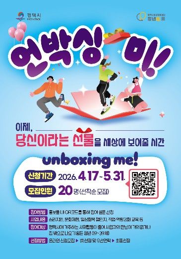 경기호연뉴스 민선기 기자 | 평택시 청년지원센터는 4월 17일부터 5월 31일까지 평택시에 거주하는 사회활동이 줄어 사람과의 만남이 거의 없거나 집 밖으로 나오기 힘든 청년의 일상 회복과 사회 참여 촉진을 위해 실시하는 지원사업 '언박싱 미!' 참여자를 모집한다.