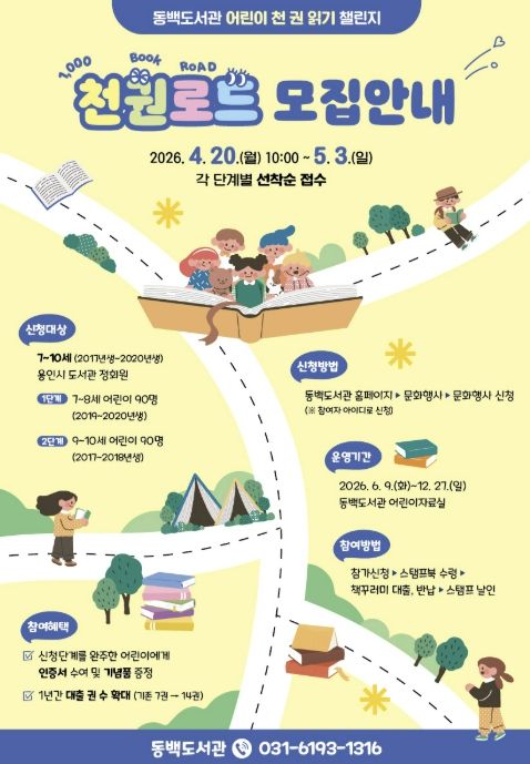 경기호연뉴스 민선기 기자 | 용인특례시 동백도서관은 어린이 천 권 읽기 챌린지 ‘천권로드(ROAD)’ 참여자를 모집한다고 20일 밝혔다.