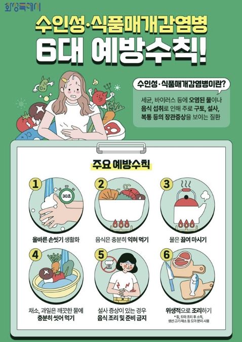 이에 시는 수인성·식품매개감염병 예방을 위한 6대 수칙을 적극 홍보하고 있다. 주요 내용은 ▲흐르는 물에 비누로 30초 이상 손 씻기 ▲음식은 중심부까지 충분히 익혀 먹기(육류 75℃, 어패류 85℃) ▲물은 끓여 마시기 ▲채소와 과일은 깨끗한 물에 씻어 먹기 ▲설사 증상 시 음식 조리 금지 ▲조리기구 용도 구분 등이다.