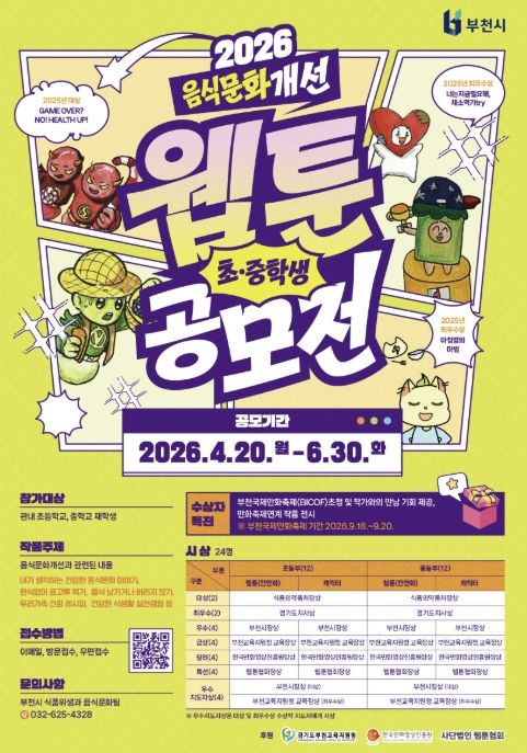 경기호연뉴스 민선기 기자 | 부천시는 4월 20일부터 6월 30일까지 ‘2026년 음식문화개선 초중학생 웹툰·캐릭터 공모전’을 연다. 이번 공모전은 학생들이 일상 속 음식문화를 주제로 직접 창작에 참여함으로써 올바른 식문화에 대한 인식을 높이기 위해 매년 추진되고 있다.