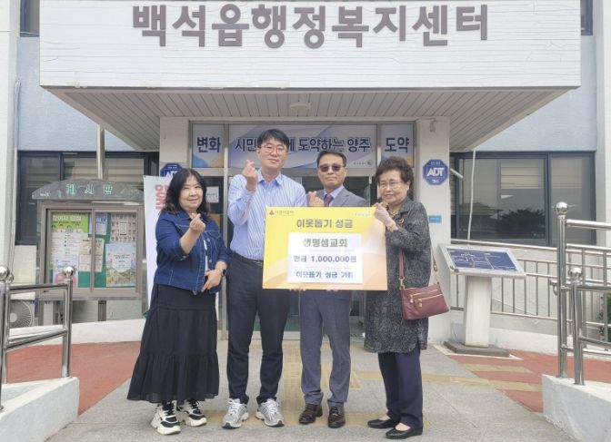 경기호연뉴스 민선기 기자 | 양주시 백석읍은 지난 17일 생명샘교회가 지역 내 어려운 이웃을 돕기 위한 성금 100만 원을 기탁했다고 밝혔다.