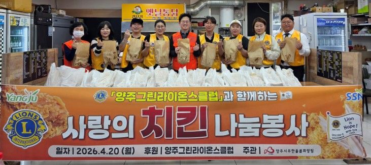 한편, 양주그린라이온스클럽은 국제라이온스협회 소속으로 2022년 11월 창단하여 양주시를 중심으로 30만 양주시민 나무 1그루 심기 행사 협력 및 취약계층 생필품 지원, 아동·청소년 학용품 지원을 비롯해 지역사회 사회복지 기관과 연계 지원하고 있으며, 양주시무한돌봄희망팀에도 지난해 여름 양주시상인회협동조합과 협력하여 삼계탕 지원 행사를 진행했다.