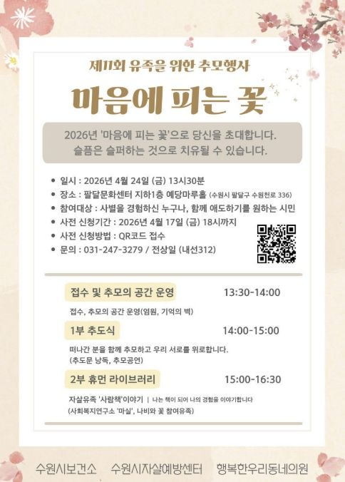 경기호연뉴스 민선기 기자 | 수원시자살예방센터가 24일 오후 1시 30분 팔달문화센터 예당마루홀에서 유족을 위한 추모행사 ‘제11회 마음에 피는 꽃’을 연다.