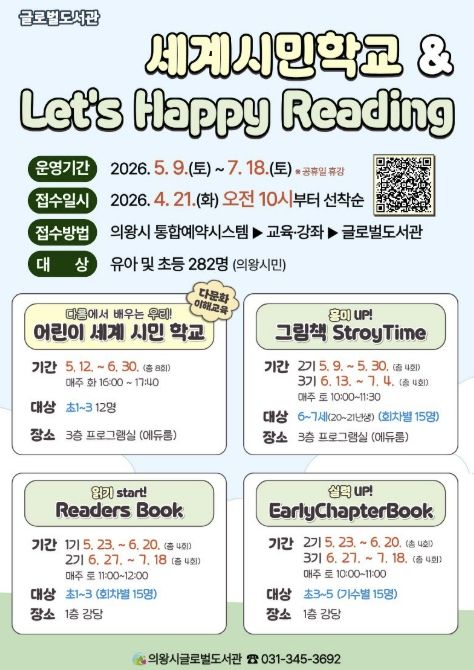 경기호연뉴스 민선기 기자 | 의왕시 글로벌도서관이 책을 통해 세상을 이해하고 체험하는 다문화 이해 프로그램 '어린이 세계 시민 학교'와 영어 읽기 문해력 향상을 위한 단계별 맞춤 프로그램 'Let’s Happy Reading'의 참여자를 모집한다.