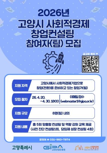 경기호연뉴스 민선기 기자 | 고양산업진흥원이 운영하는 고양시사회적경제지원센터가‘2026년 고양시 사회적경제 창업컨설팅 사업’에 참여할 예비 창업자(팀)을 오는 30일까지 모집한다.