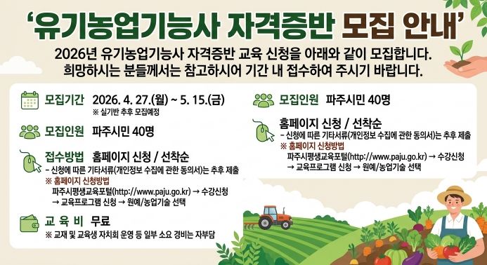 경기호연뉴스 민선기 기자 | 파주시농업기술센터는 친환경농업 분야 농업 전문 인력 육성을 위한 '2026년 유기농업기능사 자격증 취득’교육생을 4월 27일부터 5월 15일까지 모집한다.