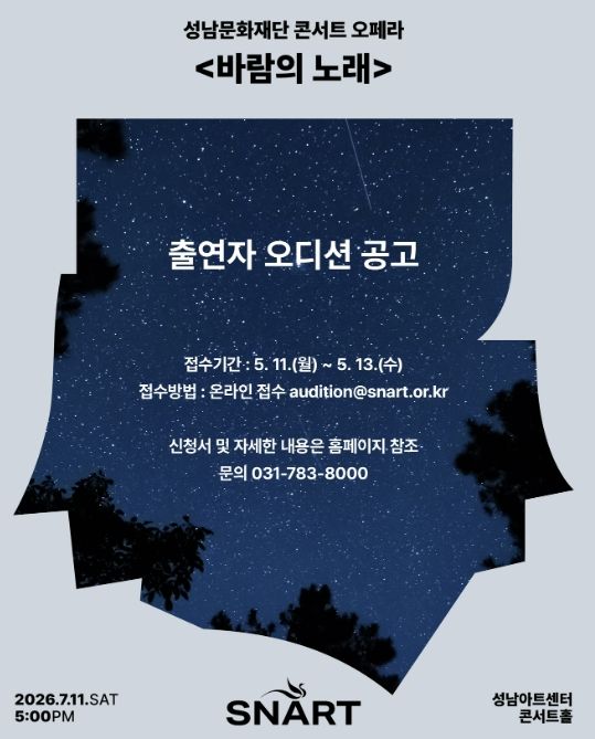오디션은 5월 19일 오후 2시부터 성남아트센터 콘서트홀에서 피아노 반주에 맞춘 지정곡 가창으로 진행되며, 합격자는 5월 22일 발표될 예정이다. 선발된 성악가는 연습을 거쳐 오는 7월 11일, 본 공연 무대에 오르게 된다. 오디션 관련 자세한 사항은 성남문화재단 홈페이지를 참고하거나, 성남문화재단 공연기획부로 문의하면 된다.