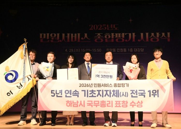 경기호연뉴스 민선기 기자 | 하남시가 전국 기초자치단체 중 최고 수준의 민원서비스 역량을 인정받으며 5년 연속 최우수 기관으로 선정됐다. 하남시는 29일 정부세종청사에서 열린 ‘2025년 민원서비스 종합평가’ 우수기관 시상식에서 국무총리 표창을 수상했다고 밝혔다.