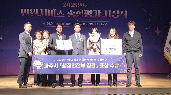 파주시 관계자는 “이번 행정안전부 장관 표창은 시민과 공직자가 함께 만든 값진 성과”라며 “앞으로도 신속하고 편리한 민원 서비스를 제공하기 위해 행정서비스 개선에 최선을 다하겠다”라고 밝혔다.