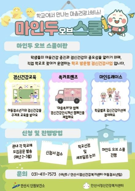 경기호연뉴스 민선기 기자 | 안산시 정신건강복지센터는 11월까지 관내 초·중·고등학교 총 10개교를 대상으로 학교로 찾아가는 정신건강사업 ‘마인두 오브 스쿨’을 운영한다고 30일 밝혔다.