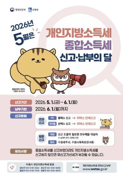 경기호연뉴스 민선기 기자 | 수원시 장안구는 2026년 개인지방소득세 신고·납부의 달을 맞아, 지난해 12월 31일 기준으로 장안구 내 주소지를 둔 개인은 5월 1일부터 6월 1일까지 개인지방소득세를 신고·납부해야 한다고 밝혔다.