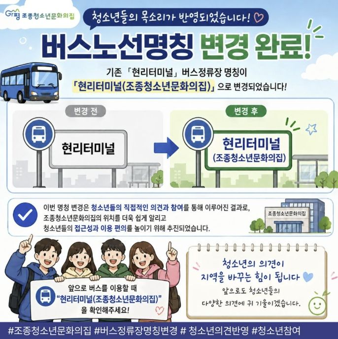 이번 명칭 변경은 청소년들이 시설 이용 과정에서 느낀 불편사항을 바탕으로 제안한 의견이 실제 지역사회 정책에 반영됐다는 점에서 의미를 더한다. 조종청소년문화의집은 현리터미널 인근에 위치해 있으나, 기존 명칭만으로는 외부 방문객이나 청소년들이 시설 위치를 인지하기 어렵다는 의견이 지속적으로 제기돼 왔다.