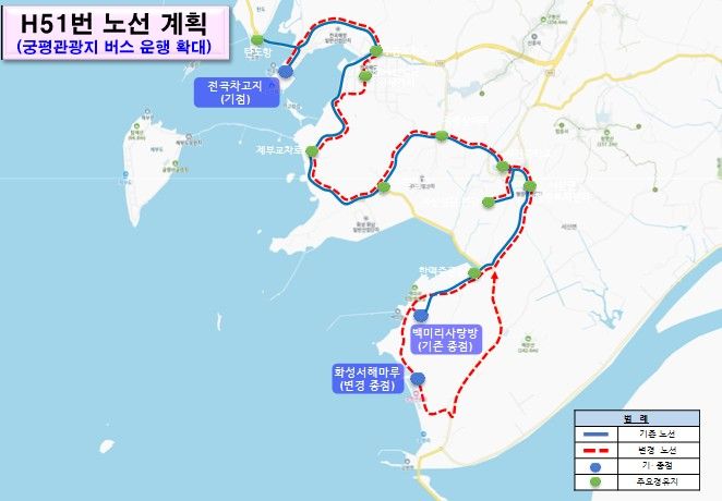이에 따라 H51·H52 노선은 전곡항차고지를 기점으로 궁평관광로를 경유해 화성서해마루유스호스텔까지 연장 운행되며, 두 노선을 교차 순환형으로 운영해 이용 편의성을 높였다. 이를 통해 서부권 주요 관광지 접근성이 개선되고, 지역 주민과 관광객 모두의 이동 편의가 향상될 것으로 기대된다.
