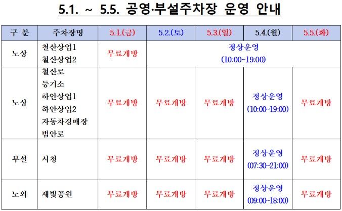 이번 무료 개방은 현장 주차관리원의 휴식 여건을 보장하고 재충전의 기회를 제공하는 한편, 징검다리 휴일 기간 주차 편의를 높여 지역 상권 활성화에도 기여할 것으로 기대된다.