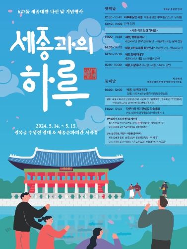 5월 14일 낮 12시 30분부터는 경복궁 영추문과 수정전, 경회루 주변에서 사전 신청자를 대상으로 전시·체험행사 ‘하루에 담은 세종’을 진행한다. 경복궁 영추문 입구에서 호패(조선시대 신분증)를 수령해 세종 시대로 시간여행을 떠나 세종의 탄생에서부터 재위 기간까지의 세종의 업적을 감상한다. 실물 크기의 어좌에서 임금의 분위기를 느껴보고, 세종의 치열함과 노력을 느껴볼 수 있는 성과들을 영상으로 만나본다. 향약집성방의 처방전을 토대로 향낭(향기 주머니)을 만들고, 세종에 대한 퀴즈(세종고사)를 풀어보며 세종의 삶에 대해 알아본다.
