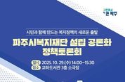 경기호연뉴스 민선기 기자 | 파주시는 오는 29일 14시, 교하도서관 3층 소극장에서 ‘파주시복지재단 설립 공론화 정책토론회’를 개최한다고 밝혔다. 이번 토론회는 파주시복지재단 설립을 앞두고 시민, 전문가, 현장 종사자의 다양한 의견을 수렴해 재단 설립의 필요성과 발전 방향을 함께 모색하기 위해 마련됐다. 토론회는 김민철 서영대학교 사회복지행정학과 교수의 기조 강연을 시작으로, 파주시 복지기획팀장의 주제 발표가 이어진다. 이어 한지원 두원공과대학교 교수가 좌장을 맡아 토론을 진행하며, 이보경 파주시문산종합사회복지관 관장, 오민수 경기복지재단 선임연구위원, 박윤근 화성시복지재단 사업본부장 등이 참석해 열띤 논의를 펼칠 예정이다. 토론에서는 ▲파주시복지재단 설립의 필요성과 추진 개요 ▲파주시 여건을 반영한 복지재단의 발전 방향 ▲재정 자립 및 지속가능성 확보 방안 등 다양한 주제가 심도 있게 논의될 예정이다. 김은숙 복지정책국장은 “파주시복지재단은 시민의 삶을 보다 세밀하게 지원하고, 지역 현장의 목소리를 반영한 ‘파주형 복지모델’을 실행할 구심점이 될 것”이라며, “이번 토론회를 통해 파주시 복지 정
