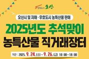 경기호연뉴스 민선기 기자 | 오산시는 민족 최대 명절 추석을 맞아 오는 24일(수)부터 26일(금)까지 3일간 오산시청 광장에서 ‘추석맞이 자매도시 농특산물 직거래장터’를 개최한다고 밝혔다. 올해 직거래장터에는 영동군, 속초시, 순천시, 진도군, 남해군, 장수군, 남원시, 공주시, 오산시 등 총 9개 시군에서 24개 업체가 참여한다. 규모 있는 장터답게 제수용품부터 선물세트까지 명절 상차림에 필요한 다양한 특산품을 만나볼 수 있다. 영동군의 포도·곶감·와인, 속초시의 젓갈류·명태강정, 순천시의 홍차·전통장, 진도군의 김·전복·울금, 공주시의 햇밤과 장류, 남원시의 강정·추어탕, 오산시의 세마쌀·전통주·호두정과 등 전국 각지의 특산품이 한자리에 모인다. 시중보다 저렴하게 판매돼 시민들의 장바구니 부담을 덜어줄 전망이다. 시는 이번 장터를 통해 자매·우호도시 농가에는 안정적인 판로를 제공하고, 시민들에게는 믿을 수 있는 농특산물을 만날 수 있는 기회를 마련해 도농 상생의 의미를 더할 계획이다. 이권재 오산시장은 “추석 장터를 통해 시민들께서 질 좋은 농특산물을 합리적인 가격에 구입하시고, 자매·우호도시