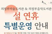 경기호연뉴스 민선기 기자 | 의정부시는 2026년 설 명절을 맞아 시민과 귀성객들이 풍성한 연휴를 보낼 수 있도록 미술도서관과 음악도서관을 특별 운영한다. 이번 특별 운영은 연휴 기간 중 설 당일인 2월 17일(화)을 제외한 16일(월)과 18일(수), 이틀간 오전 9시부터 오후 6시까지 진행된다. 두 도서관은 예술과 휴식이 어우러진 공간으로 운영되고 있으며, 연휴 기간 도심에 머무는 시민들이 자유롭게 이용할 수 있도록 개방된다. 시는 이번 특별 개방이 명절 기간 시민은 물론 의정부를 찾은 귀성객 등 방문객에게 지역의 특색 있는 문화공간과 예술 콘텐츠를 알리는 계기가 될 것으로 기대하고 있다. 도서관 관계자는 “설 연휴를 맞아 가족, 친지들과 함께 도서관에서 예술을 향유하며 재충전의 시간을 보내길 바란다”며 “앞으로도 시민들의 일상 속에 문화가 자연스럽게 흐르는 도서관 서비스를 제공하기 위해 노력하겠다”고 말했다.