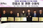 경기호연뉴스 민선기 기자 | 용인특례시는 3일 본관 4층 전겹실에서 일자리 창출에 힘쓴 지역 우수기업 8곳에 인증서와 현판을 수여했다. 이번에 선정된 기업은 ▲아산디앤씨 주식회사 ▲일승푸드 제2공장 ▲주식회사 에이치에스씨 ▲㈜인실리코젠 ▲주식회사 홈체크 ▲㈜휴먼인텍 ▲케이제이건설산업(주) ▲트루션 등 총 8개사다. 시는 1차 서류심사와 2차 현장실사를 거쳐 일자리 창출 실적, 고용 안정성, 기업의 성장 가능성, 근로환경 등을 종합적으로 평가해 우수기업을 선정했다. 이들 기업은 최근 1년간 총 74명(기업당 4~19명)을 신규 채용해 지역 내 일자리 창출에 기여했다. 또, 다양한 직원복지제도로 근무하기 좋은 환경을 조성해 일자리의 질을 높이는 데 크게 힘쓴 것으로 평가됐다. 이들 기업에는 인증서와 현판이 수여되며, 시가 주최하는 일자리사업, 기업지원사업 참여 시 가점이 주어진다. 일자리박람회 등 채용 행사에도 우선적으로 참여할 수 있다. 용인특례시 일자리창출 우수기업 인증제는 2018년부터 시행되고 있으며, 매년 고용 확대와 일자리 창출에 기여한 기업을 발굴·지원하고 있다.