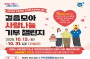 경기호연뉴스 민선기 기자 | 군포시 산본보건지소는 오는 10월 13일부터 31일까지(19일간) 국민건강보험공단 군포지사와 함께하는 '걸음모아 사랑나눔' 기부챌린지를 운영한다. ‘걸음모아 사랑나눔’ 기부챌린지는 2023년부터 군포시와 국민건강보험공단 군포지사가 협력해 추진해 온 사회공헌형 걷기 사업이다. 시민들이 일상 속에서 걸음을 모아 목표를 달성하면 이를 기부로 연계해 취약계층에 전달하는 방식으로 진행되며 시민과 지역 내 기업·단체가 함께 참여해 건강한 나눔 문화를 지역사회에 확산시키고 있다. 기부챌린지는 군포시민 누구나 참여할 수 있으며 참여 기간은 10월 13일부터 31일까지이다. 참여방법은 워크온 앱을 설치한 뒤 ‘군포시 공식 커뮤니티’에 가입해 챌린지에 참여하면 된다. 챌린지 기간 동안 누적 목표 걸음 수 1억 5천만보를 달성하면 국민건강보험공단 군포지사에서 기부하는 총 100만 원의 기부금이 관내 아동복지시설과 지역아동센터 2곳에 전달될 예정이다. 김미경 군포시 보건소장은 “이번 챌린지는 단순히 건강을 위한 걷기를 넘어 시민 한 분 한 분의 발걸음이 모여 취약계층을 돕는 소중한 나눔으로 이어진다는 데