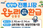 경기호연뉴스 민선기 기자 | 파주시는 2026년 설 명절을 맞아 고물가로 인한 시민들의 가계 부담을 덜고 지역 전통시장 활성화를 도모하기 위해 ‘설맞이 농축산물 온누리상품권 환급 행사’를 실시한다. 이번 행사는 농림축산식품부가 주관하는 ‘농축산물 할인지원’사업의 일환으로, 본격적인 제수용품 구매 기간인ق월 10일부터 14일까지 5일간 관내 전통시장 2곳(봉일천전통시장, 금촌전통시장)에서 진행된다. 행사 기간 동안 참여 점포에서 국산 농축산물을 구매한 고객은 구매 금액에 따라 1만 원 또는 2만 원 상당의 온누리상품권을 환급받을 수 있다. 환급 기준은 ▲구매 금액이 3만 4천원 이상 6만 7천 원 미만일 경우 1만 원 ▲6만 7천 원 이상일 경우 2만 원이며, 환급 한도는 1인당 최대 2만 원이다. 단, 예산 소진 시 행사는 조기 종료될 수 있다. 환급을 희망하는 고객은 당일 구매 영수증과 신분증을 지참해 각 시장 내에 마련된 지정 환급처를 방문하면 된다. 환급 대상 품목은 국산 농산물 및 축산물이며, 수입산 농축산물이나 법인카드 결제 내역, 제로페이 모바일 상품권 결제 내역 등은 환급 대상에서 제외