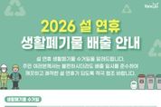 경기호연뉴스 민선기 기자 | 양주시가 설 연휴 기간 시민과 방문객의 불편을 줄이기 위해 ‘2026년 설 연휴 생활폐기물 관리 대책’을 추진한다. 양주시는 설 연휴가 시작되는 오는 2월 14일부터 18일까지를 특별 관리 기간으로 정하고, 연휴 기간 중 급증하는 생활폐기물로 인한 불편을 최소화할 방침이다. 시는 종량제봉투, 음식물류 폐기물, 재활용품 등 생활폐기물을 2월 14일과 16일 이틀간 정상 수거한다. 공동주택에서 발생하는 음식물류 폐기물은 2월 18일 별도 수거해 연휴 기간 배출된 폐기물이 장기간 방치되는 것을 막을 계획이다. 또 연휴 기간 중 쓰레기 민원과 긴급 상황에 신속히 대응하기 위해 상황근무반을 편성하는 등 비상 청소체계를 구축·운영한다. 양주시 관계자는 “설 연휴 기간 생활폐기물 발생을 줄이기 위한 시민들의 적극적인 협조가 필요하다”며 “생활폐기물은 정해진 수거 일정에 맞춰 배출해 주시고, 수거일 전날 오후 8시부터 수거일 당일 오전 6시까지 배출 시간을 반드시 지켜달라”고 당부했다.