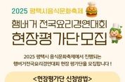 경기호연뉴스 민선기 기자 | 평택시는 오는 25일 농업생태원에서 ‘2025 평택시 음식문화축제’를 통해 ▲전국 요리경연대회 ▲평택 지역 맛집 및 세계음식 시식·체험관 ▲노 오븐 베이킹 체험관 ▲탄소중립 실천·홍보관 등 다채로운 부스가 운영돼 시민들에게 풍성한 경험을 선사할 예정이다. 전국 요리경연대회는 ‘평택의 맛, 나만의 아이디어로 버거를 완성하다’를 주제로 총 18팀(일반부 10, 가족부 8)이 본선에 진출해 열띤 경연을 펼친다. 지난해와 달리 참가 부문이 일반부와 가족부로 확대됐으며, 시상 규모도 10팀 740만 원으로 늘어나 큰 기대를 모으고 있다. 경연대회의 생생한 현장을 함께할 시민 현장평가단도 사전 모집한다. 10월 24일(금) 오전 9시부터 오후 5시까지 일반부와 가족부 각 20명씩 무작위로 선착순 접수받으며, 편식 없는 고등학생 이상이라면 누구나 신청할 수 있고, 선정된 지원자는 실제 경연 현장에서 요리를 맛보고 평가하게 된다. 또한, 오전 10시에는 빵과당신 인재홍(대한민국 제과명장)이 진행하는 베이킹 체험이 마련돼 있으며, 참가 신청은 24일(금) 오전 10시부터 평택예총 공식 블로그 및 평