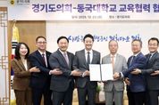 경기호연뉴스 민선기 기자 | 경기도의회는 23일 오전 의장 접견실에서 동국대학교와 교육협력 및 학술교류를 위한 업무협약(MOU)을 체결했다. 이날 협약식에는 김진경 의장(더민주, 시흥3)과 고준호 의원(국민의힘·파주1), 김완규 의원(국민의힘·고양12), 이병숙 의원(더민주·수원12), 박호순 의정국장이 참석했다. 동국대학교에서는 윤재웅 총장, 김용현 교무부총장, 김승용 대학원장, 유한림 BMC(바이오메디캠퍼스) 행정처장 등이 함께 자리해 협약의 의의를 더했다. 양 기관은 이번 협약을 계기로 ▲의정 발전을 위한 정보 교류 ▲전문 인재 양성을 위한 교육·연구 지원 ▲도의원 및 의회 직원 대상 대학원 장학금 지원 등 의정 활동 역량 강화를 위한 체계적인 교육 협력에 나서기로 했다. 윤재웅 총장은 “대학의 교육·연구 역량을 공유함으로써 경기도 발전에 기여할 수 있게 되어 뜻깊다”며 “경기도의회와의 지속적인 협력을 통해 실효성 있는 교육 지원을 이어갈 수 있도록 최선을 다하겠다”라고 말했다. 김진경 의장은 “의회에 대한 도민의 기대는 점점 더 복잡해지고 다양화되고 있는 만큼 의회 구성원 모두가