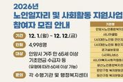 경기호연뉴스 민선기 기자 | 안양시가 1일부터 12일까지 건강하고 활기찬 노후를 위한 ‘2026년 노인일자리 및 사회활동 지원사업’의 참여자 4,998명을 모집한다. 참여자 규모는 유형별로 ▲노인공익활동 3,155명 ▲노인역량활용 1,106명 ▲공동체사업단 574명 ▲취업지원 163명 등이다. 노인일자리사업의 수행기관은 ▲안양시노인종합복지관 ▲비산노인종합복지관 ▲안양시니어클럽 ▲만안·동안노인지회 ▲경기실버포럼 ▲(사)위니버스 ▲시니어복지사회적협동조합 ▲만안구청 ▲동안구청 등 10곳이며, 참여자는 수행기관에서 추진하는 다양한 일자리·사회활동에 참여하게 된다. 신청 자격은 공고일(11월 27일) 기준 안양시에 주민등록이 되어 있는 어르신이다. 세부 기준은 ▲노인공익활동은 65세 이상 기초연금·직역연금 수급자(배우자 포함) ▲노인역량활용은 65세 이상(일부 유형은 60세 이상) ▲공동체사업·취업지원은 60세 이상이다. 다만, 생계급여 수급자(취업지원 제외), 건강보험 직장가입자, 장기요양등급자 등 일부 대상자는 신청이 제한된다. 희망자는 신분증과 주민등록등본 등을 지참하고 해당 수행기관 또는