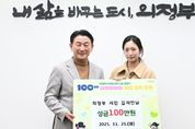 경기호연뉴스 민선기 기자 | 의정부시는 11월 25일 시민 김지민 씨가 ‘100일간 사랑릴레이 배턴 잇기’에 동참해 성금 100만 원을 기부했다고 밝혔다. 김지민 씨는 “기부는 멀리 있는 것이 아니라 내가 할 수 있는 작은 실천에서 시작된다”며 “약소한 금액이지만 주변 어려운 이웃에게 전달돼 많은 도움이 됐으면 좋겠다”고 전했다. 김동근 시장은 “어려운 경제 상황 속에서도 따뜻한 나눔을 실천해 주신 김지민님께 감사드린다”며 “요즘같이 경제가 어려운 시기에 직접 땀을 흘려 번 돈을 이웃을 위해 기부하는 활동은 지역사회에 희망과 온기를 더해줄 것”이라고 말했다. 시는 지난 11월 5일부터 2026년 2월 12일까지 ‘100일간 사랑릴레이 배턴 잇기’ 모금 운동을 진행하고 있으며, 모금된 현금과 현물은 공동모금회와 연계해 의정부시 저소득층에게 지원하고 있다.