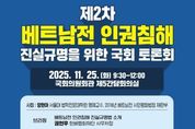 경기호연뉴스 민선기 기자 | 민형배 의원(더불어민주당, 광주 광산을)이 마련한 '제2차 베트남전 인권침해 진실규명을 위한 국회 토론회'가 내일(25일) 오전 9시 30분부터 국회의원회관 제5간담회의실에서 개최된다. 이번 토론회는 베트남전 파병군인 인권침해에 대한 진실규명 문제를 논하는 최초의 공개 토론회이다. 지난 9월 30일 민형배 의원은 '베트남전쟁 시기 대한민국 국군에 의한 민간인 및 파병군인 등에 대한 인권침해 사건 진실규명특별법안'(민형배 의원 등 30명 공동발의, 이하 베트남전 진실규명법)을 발의했다. 이 법안은 한국군에 의한 집단학살 등 인권침해 사건뿐만 아니라 파병군인의 자살·전쟁 후유증 등을 조사 범위에 포함하도록 한다. 법안 발의에 이어 개최되는 이번 토론회에서는 베트남전 파병군인이 겪은 군 내부 폭력·자살·전쟁 후유증 등의 인권침해를 중심으로 논의한다. 양현아 서울대 법학전문대학원 명예교수가 사회를 맡고, 하미학살 피해생존자 응우옌티탄이 영상 발언을 통해 베트남전 진실규명법 제정을 국회와 시민사회에 호소한다. 노용석 교수(국립부경대학교)가 “베트남전 파병과 민주주의, 그리고 파병군인의
