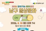 경기호연뉴스 민선기 기자 | 대구 남구는 지역 주민들에게 일상 속 문화 향유 기회를 확대하고, 지역 예술가들의 공연 활동을 지원하기 위해 ‘2026 찾아가는 문화공연’ 을 개최한다. 관내 신규 입주 공동주택을 대상으로 공연을 희망하는 아파트 단지를 선정하였으며, 오는 4월 14일(화) 앞산비스타동원 아파트에서 첫 공연을 진행할 예정이다. 저녁 7시에 열리는 ‘앞산비스타동원 음악회’에서는 인기 개그맨 김재롱이 사회를 맡고, 지역 가수 이새벽과 미스트롯 4 출연자 장혜리 가수가 공연을 펼친다. 또한, 아파트 입주 후 처음으로 열리는 주민 참여 행사인만큼 입주자 대표회에서도 다양한 경품과 선물을 준비하여 주민 화합의 장을 만들 예정이다. 조재구 남구청장은 “대규모 축제나 행사도 중요하지만, 주민들이 사는 가까운 동네에서 편하게 문화예술을 접할 수 있도록 찾아가는 문화행정을 적극 추진하겠다.”라며, “아파트로 찾아가는 음악회를 통해 주민들이 일상에서 소소한 행복을 느끼며 힐링할 수 있기를 바란다.”라고 전했다. ‘찾아가는 문화공연’에 대한 문의는 남구 문화관광과 문화예술팀으로 연락하면 안내받을 수 있다.