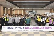 경기호연뉴스 민선기 기자 | 성남시는 폭설에 대응하기 위해 수정, 중원, 분당 등 구별로 시민들이 참여하는 제설봉사단을 구성해 운영하고 있다고 18일 밝혔다. 이를 위해 수정구는 지난 12월 16일 오후 2시 구청 1층 대회의실에서 수정경찰서와 합동 대책회의를 하고, 제설봉사단 발대식을 개최했다. 수정구는 경찰과의 합동 대책회의 자리에서 지난 12월 4일 단시간에 집중된 폭설 당시의 현장 대응체계를 점검하고, 도로 교통혼잡과 안전사고 발생을 최소화하기 위한 기관 간 협력 방안과 대응 매뉴얼을 논의했다. 이어진 수정구 제설봉사단 발대식엔 전체 단원 1122명 가운데 100명이 참석해 폭설로 인한 주민 불편을 최소화하고 적극적인 제설 자원봉사 활동에 참여할 것을 다짐했다. 제설봉사단은 강설 시 이면도로 경사로, 보도, 육교 등 제설 취약 지역에 우선 투입된다. 전경만 수정구청장은 “제설봉사단은 제설 작업 이외에도 ‘내 집 앞, 눈 치우기’를 주변에 적극적으로 홍보해 주민들의 관심과 협조를 이끌어 내는 역할도 중요하다”면서 “민‧관‧경의 유기적인 협력을 통해 주민들이 안전하게 겨울을 날 수