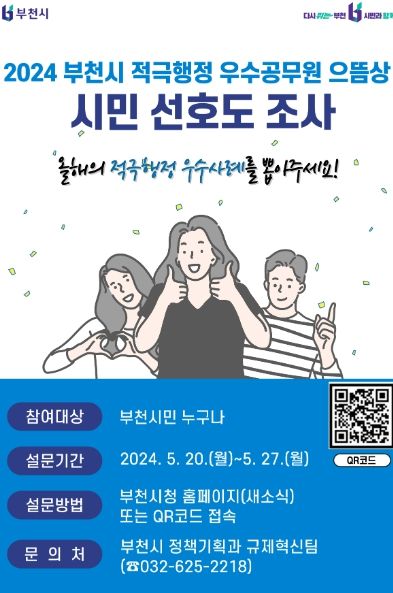 경기호연뉴스 민선기 기자 | 부천시가 2024년도 적극행정 우수공무원 으뜸상 선발을 위한 시민 온라인 정책선호도 조사를 5월 20일부터 27일까지 실시한다고 밝혔다.
