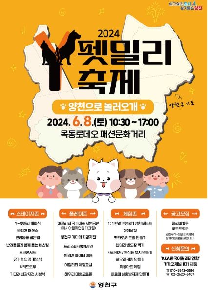 경기호연뉴스 민선기 기자 | 양천구는 6월 8일 목동로데오 패션거리 일대에서 역대 최대 규모 반려동물 체험형 문화행사인 ‘2024 Y펫밀리 축제’를 개최한다고 밝혔다.