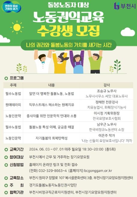 이번 프로그램은 경기도돌봄노동자노동인권사업단이 주관하고 부천시비정규직근로자지원센터와 협력하여 부천시장기요양요원지원센터에서 진행한다. 돌봄노동의 수요는 급격히 증가하여 필수노동자로 인식되고 있으나 사회적 처우가 열악한 장기요양요원들이 기본적인 노동권에 대한 이해를 높임으로써 자신들의 권리를 보호할 수 있도록 노동관련 법규 및 제도에 대한 지식을 제공할 예정이다.