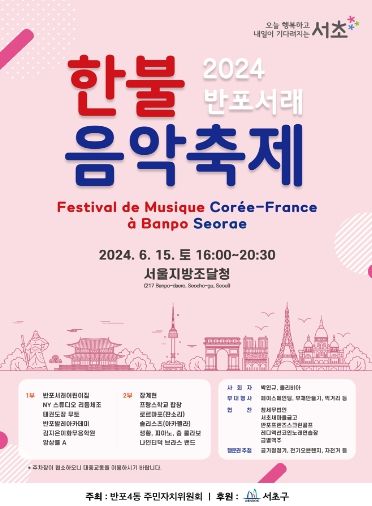 서울 서초구가 오는 15일 서래마을 인근 서울지방조달청에서 ‘2024 반포서래 한·불 음악축제’를 연다고 밝혔다.