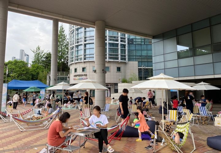 이번 행사에서는 시민의 ‘쉼’이 중요한 목표인 만큼 광명도서관 앞 너른 야외마당에 캠핑 의자, 해먹, 돗자리 등 편하면서 다채로운 좌석을 설치하고 가볍게 읽을만한 만화책을 주변에 배치했다.