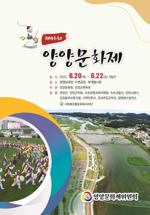경기호연뉴스 민선기 기자 | 양양군민의 대화합 향토문화축제인 제46회 양양문화제가 6월 20일부터 22일까지 3일간 양양남대천 수변공원 일원에서 개최된다.