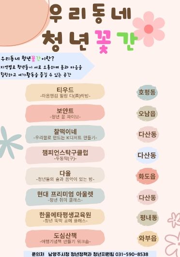 경기호연뉴스 민선기 기자 | 남양주시는 청년들이 지리적으로 쉽게 접근할 수 있는 지역별 청년 공간인 ‘우리동네 청년꽃간’(생활밀착형 청년공간) 총 8개소 선정했다고 18일 밝혔다.