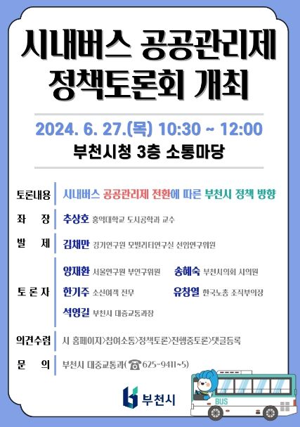 경기호연뉴스 민선기 기자 | 부천시는 오는 6월 27일 오전 10시 30분 부천시청 3층 소통마당에서 ‘부천시 시내버스 공공관리제 정책토론회’를 개최한다.
