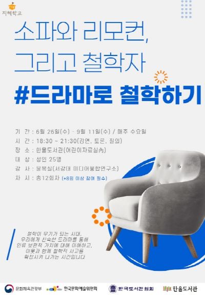 경기호연뉴스 민선기 기자 | 파주 한울도서관이 문화체육관광부가 주관하고 한국문화예술위원회와 한국도서관협회에서 운영하는 ‘2024년 지혜학교’ 공모사업에 선정되어 ‘드라마로 철학하기’ 프로그램을 6월 26일부터 운영한다.
