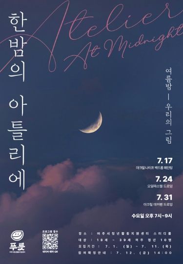경기호연뉴스 민선기 기자 | 여주시 청년활동지원센터는 여주시 청년들의 문화생활 참여기회 확대를 위해 미술을 주제로 한 7월 ‘한밤의 아틀리에’ 프로그램을 진행한다