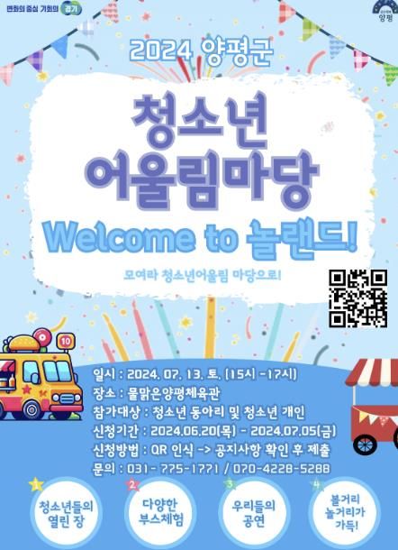 청소년어울림마당은 청소년들이 다양한 문화 활동을 주도적으로 참여 할 수 있도록 기회를 제공해 청소년들의 문화적 감수성 및 역량 증진을 도모하는 사업이다. 올해는 관내 청소년들에게 문화·축제의 장을 상시 제공하기 위해 양평군이 진행을 맡았다.