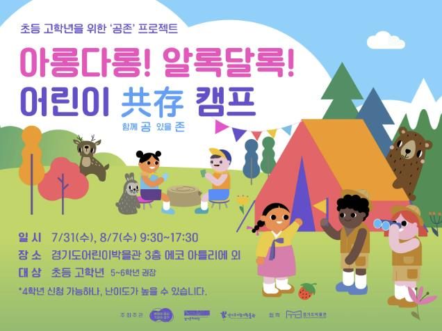 '아롱다롱! 알록달록! 어린이 공존 캠프'는 2024년 7월 31일 및 8월 7일, 총 2회 운영되고, 진행시간은 오전 9시 30분부터 오후 5시 30분까지이며 중식이 제공된다. 장소는 주로 3층 에코 아틀리에에서 진행되며, 경기도박물관 투어도 포함되어 있다. 초등 4-6학년 모두 신청 가능하나, 토론 난이도가 높을 수 있어 5-6학년에게 권장한다. 신청 가능한 최대 인원은 회당 20명이며, 지지씨멤버스를 통해 사전예약이 필요하다. 접수기간은 7/31 캠프는 7/28까지, 8/7 캠프는 8/4까지이다. 참가비는 20,000원이며 박물관 입장권은 별도 구매하지 않아도 된다. 자세한 내용은 경기도어린이박물관 누리집을 통해 확인할 수 있다.