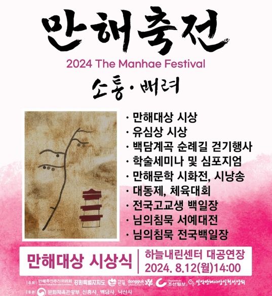 인제군과 만해축전추진위원회는 8월 5일부터 오는 10월까지 인제군 일원에서 ‘2024년 제26회 만해축전’을 개최한다고 밝혔다.