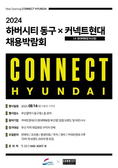 경기호연뉴스 민선기 기자 | 부산 동구는 오는 8월 14일 커넥트현대(구 현대백화점 부산점)와의 업무협약 체결식 및 채용박람회를 개최한다. 이번 행사는 커넥트현대의 리뉴얼 오픈을 앞두고 지역 사회의 일자리 창출과 상생 발전을 도모하기 위해 마련됐으며 많은 구직자들에게 단비 같은 소식이 될 것으로 기대된다.